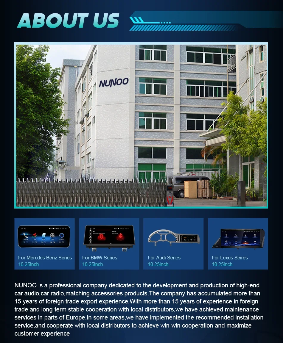 1. NUNOO is AliExpress top Brands,15 years of professional production and sales. mainly sell For Audi BMW BENZ LEXUS car multimedia, popular among customers. our goal is supply best product and service for our client, also supply free firmware update