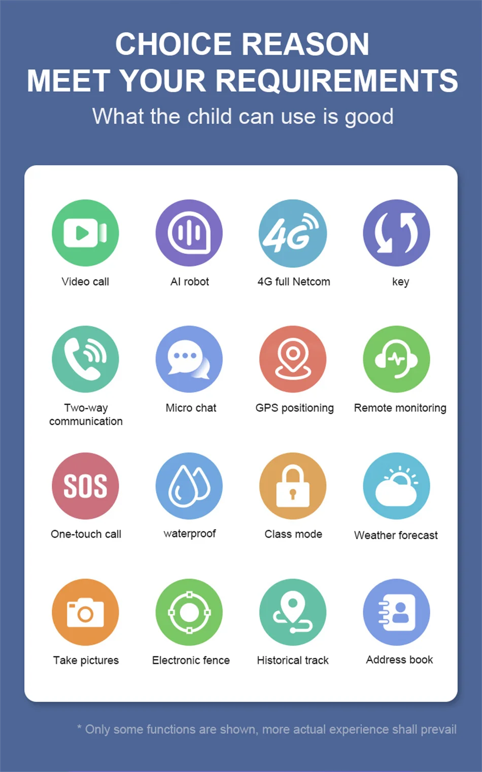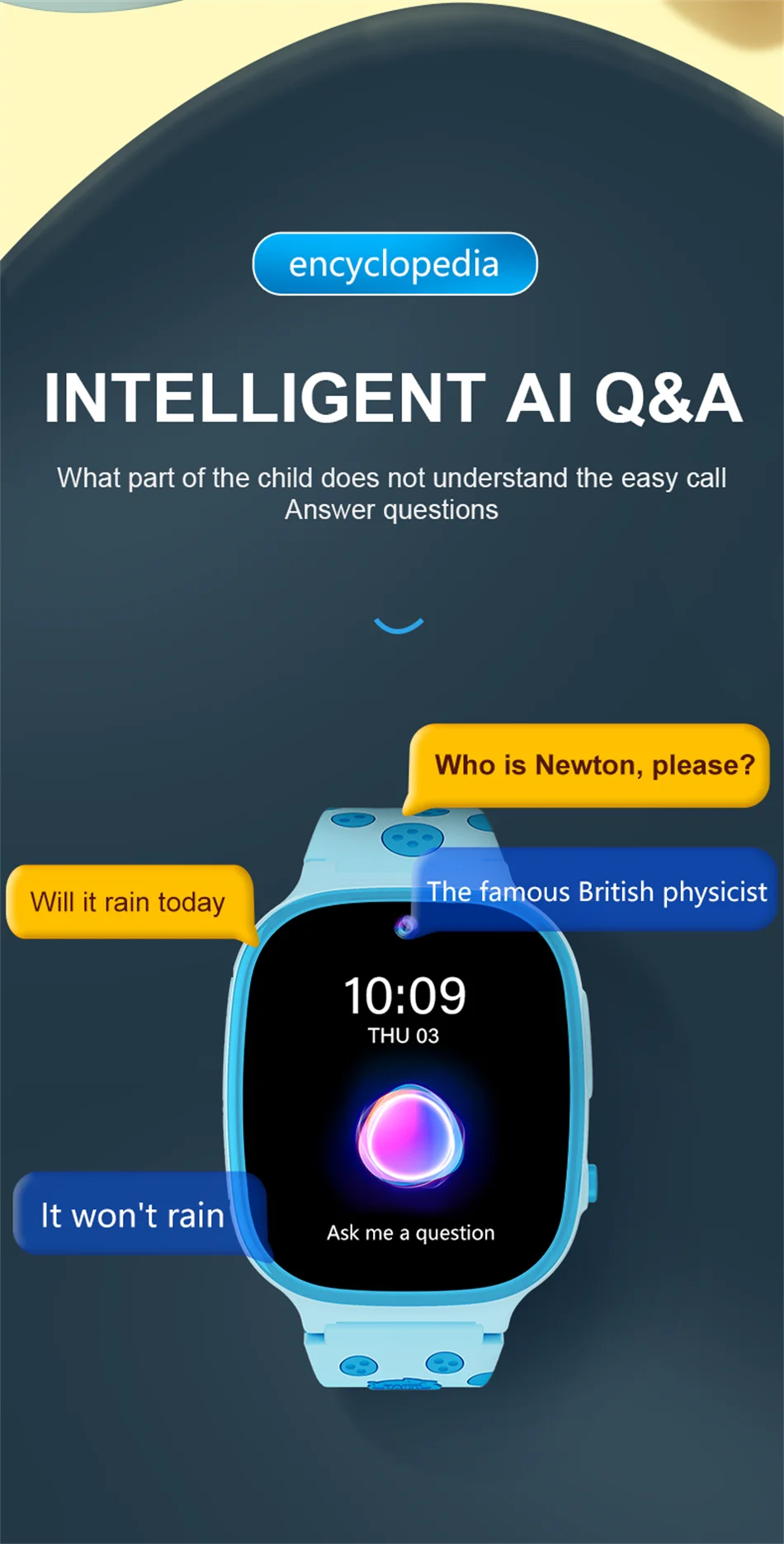 - Features:Â Dynamic watch UI, Phonebook, Dial pad, call log, Text message, Q chat, Video call, Camera, Gallery, QR code, Tools (Step counter, Alarm clock, Calculator, Stopwatch), Settings, Class chedule, Face ID, Super power saving mode, Application market