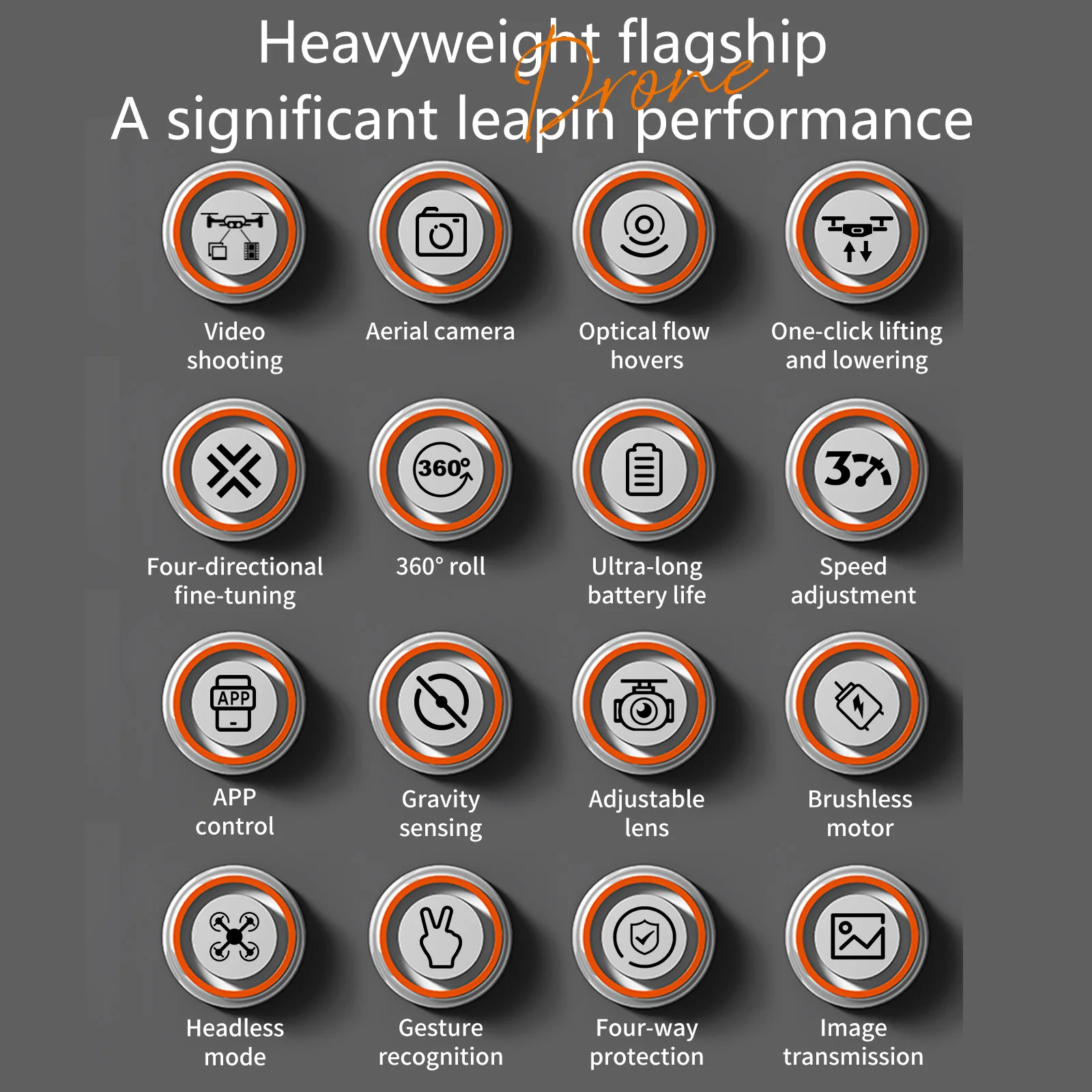 One key start, brushless motor, electrically adjustable camera, with optical flow positioning, dual camera switching, one key takeoff/landing, ascent and descent, forward and backward, left and right side flight, steering, headless mode, one key roll, one key calibration (with camera added functions: gesture photography, video recording, headless mode, emergency stop, trajectory flight, automatic photography)