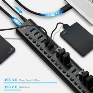 1.USB powered Hub with 7/10/13/16 individual on/off switches to control each USB port. Saves the trouble of unplugging devices whenever you don’t need it.