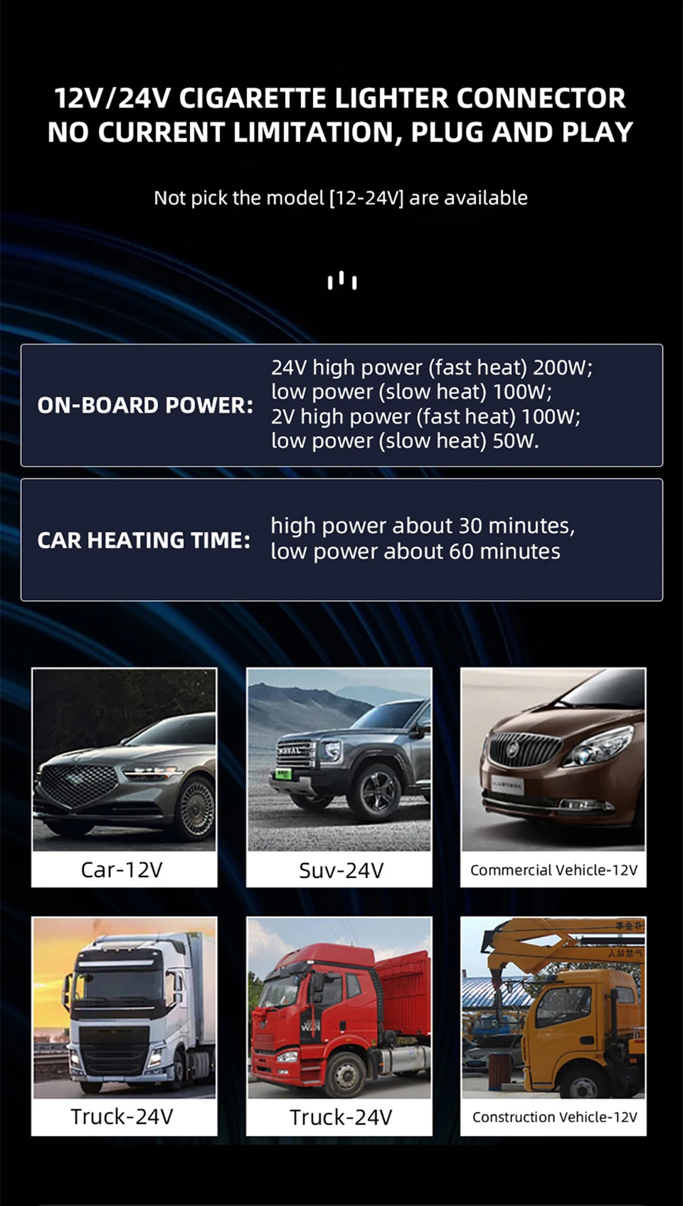 12V/24V car cigarette lighter connector, no current limit, plug and play.