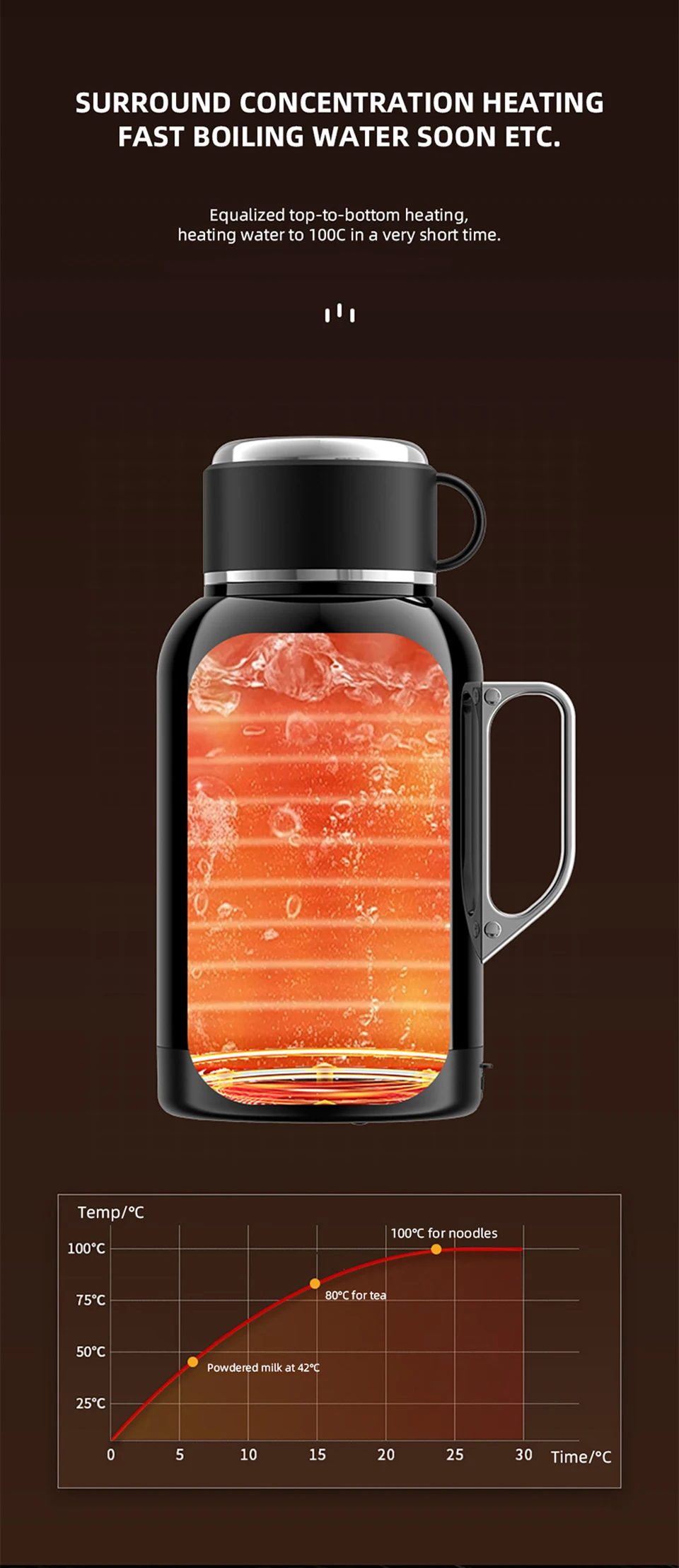 Adopting the surrounding centralized heating technology, it can quickly boil water and heat it to 100 ℃ in a short time, meeting the water temperature requirements of different scenarios, such as making milk powder (42 ℃), brewing tea (80 ℃), boiling noodles (100 ℃), etc., adapting to various usage scenarios.