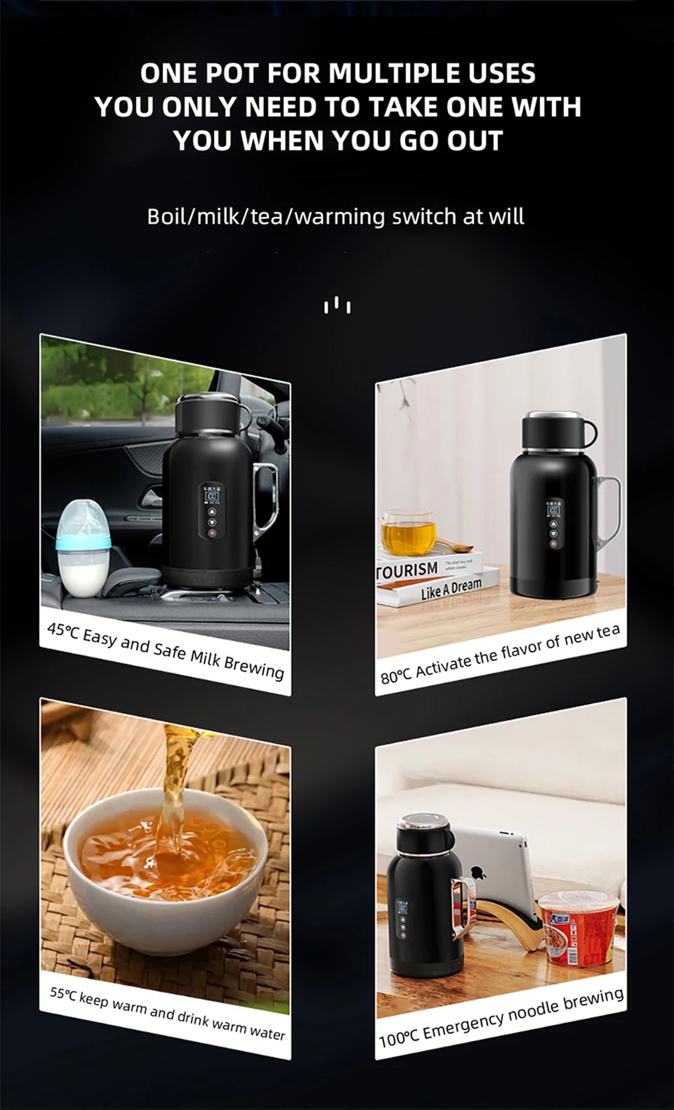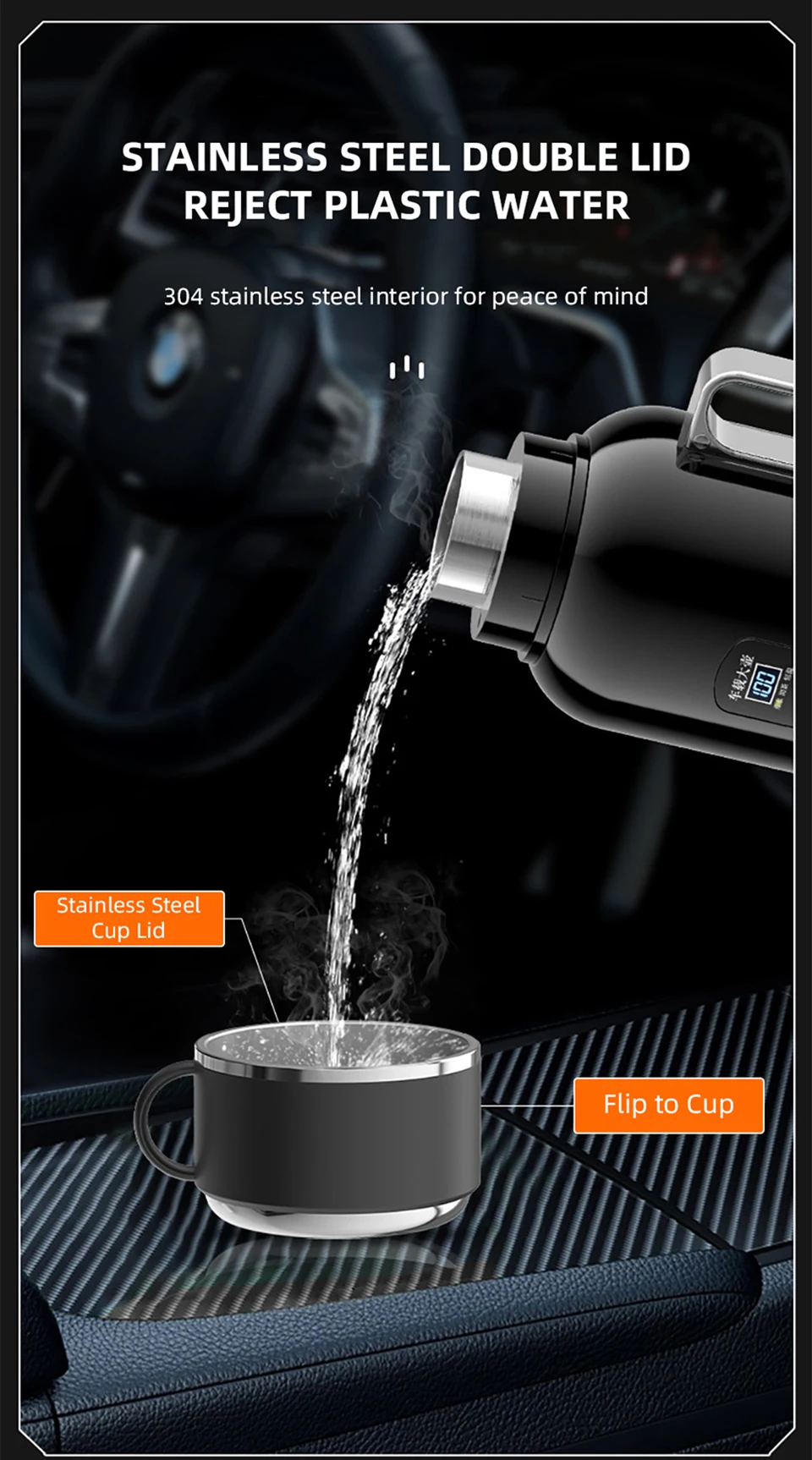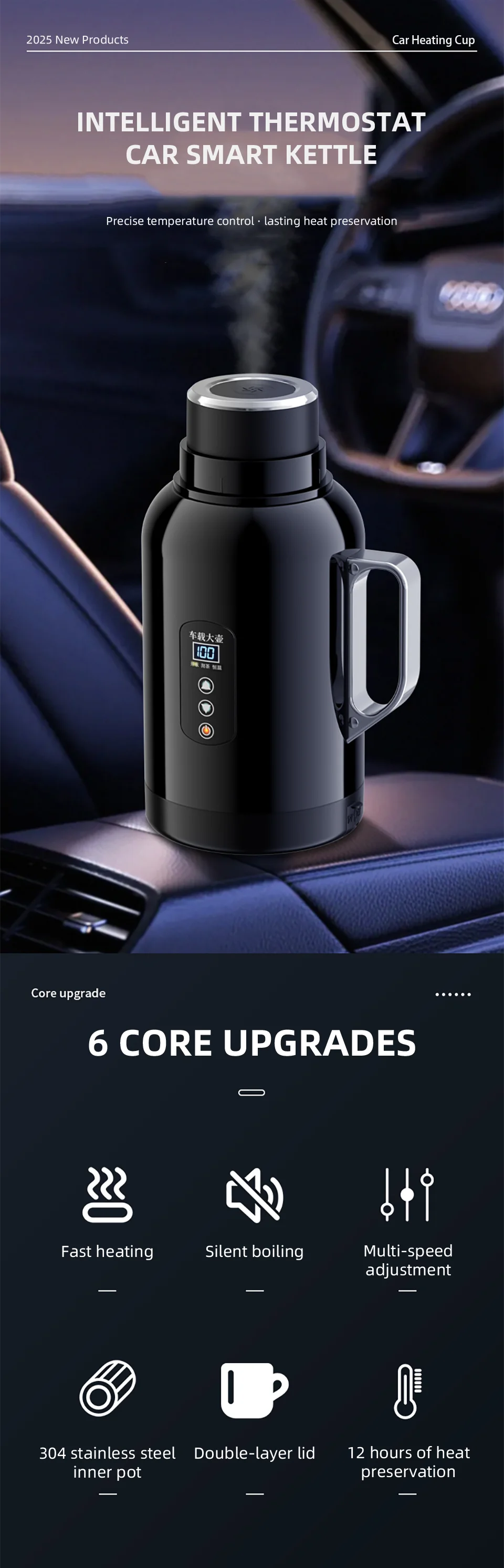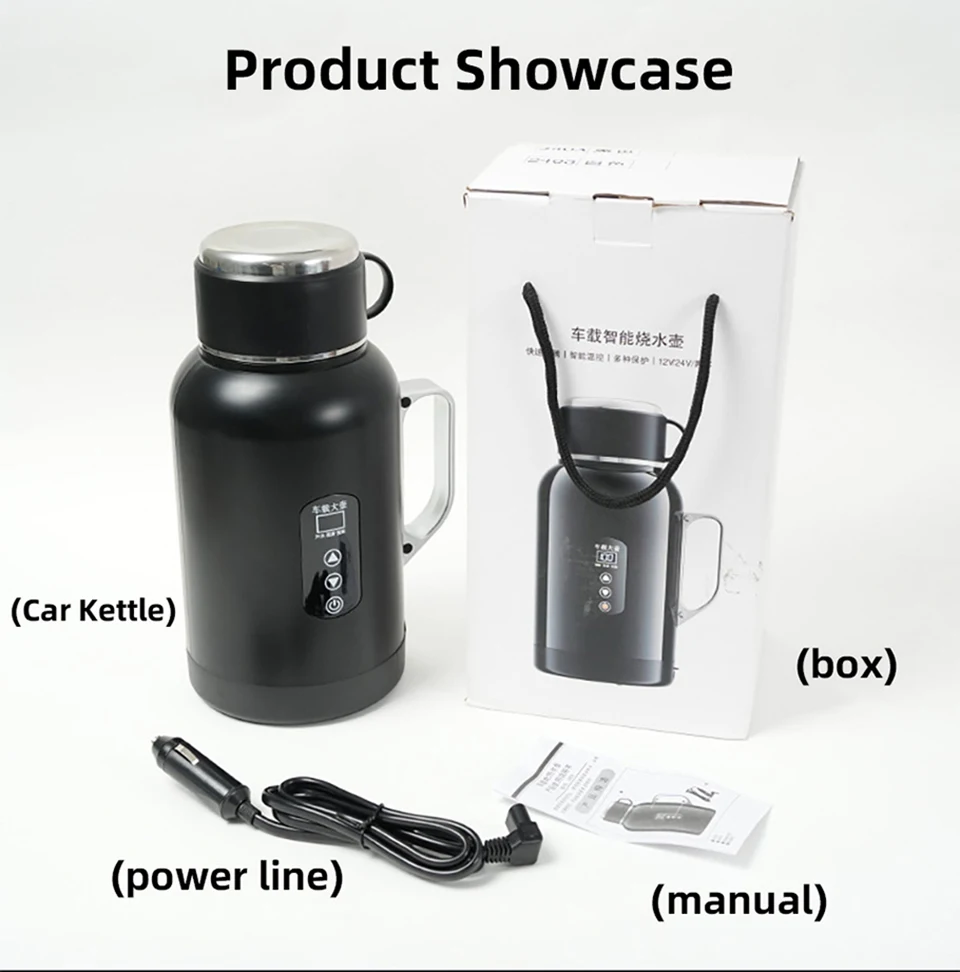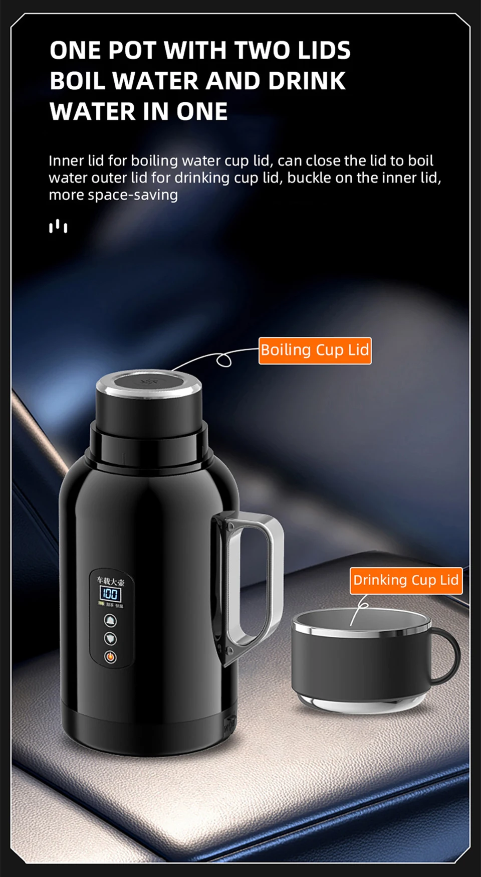 The cup lid can be used as a cup, 1300ML ultra large capacity multifunctional intelligent temperature control car kettle.Fast boiling water, 12V/24V universal.
