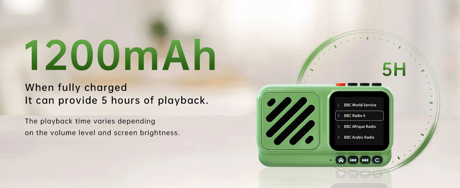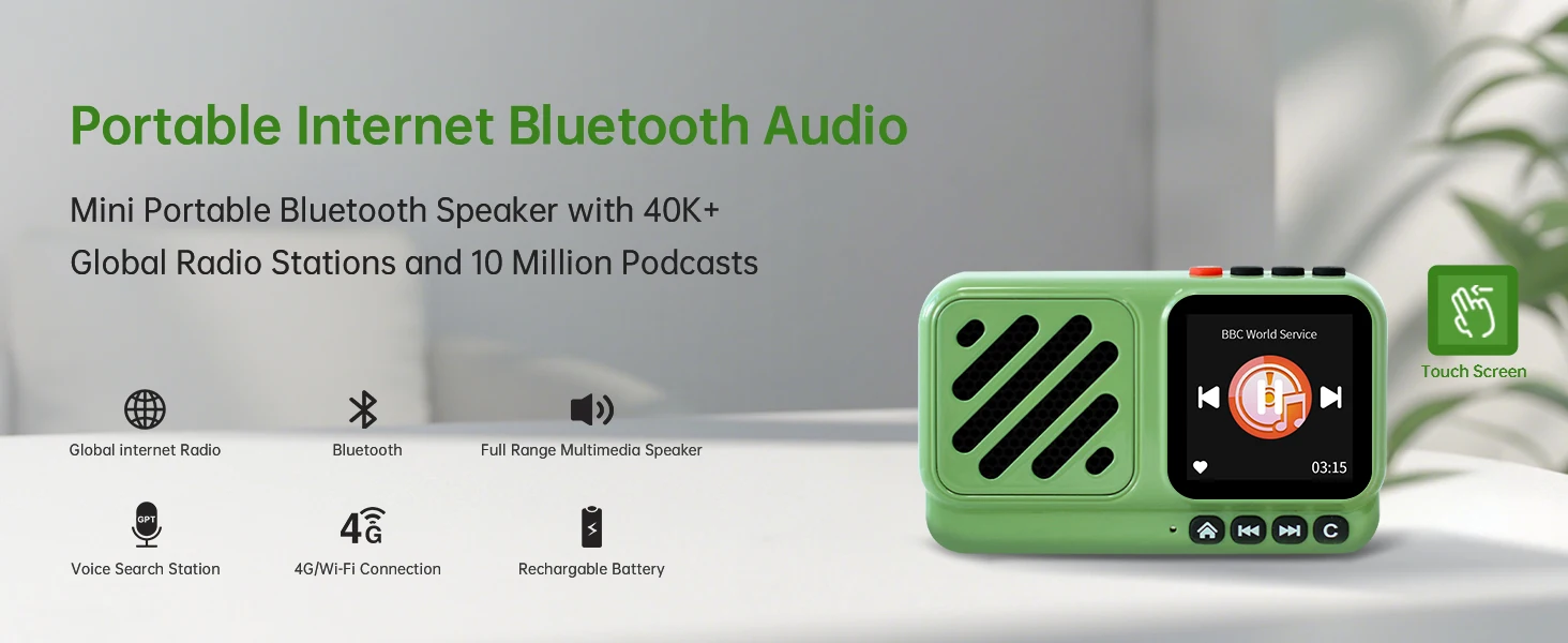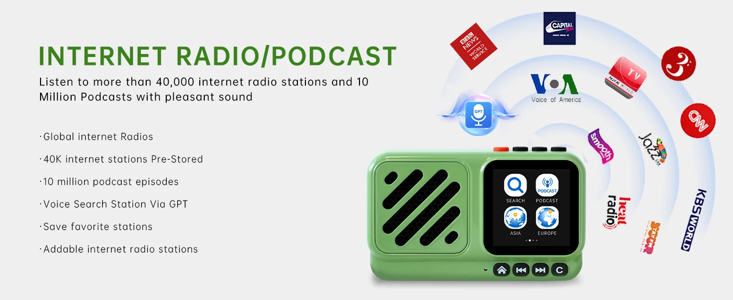 Surprise features: equipped with GPT, you can directly voice on-demand machine in all radio stations and podcasts, but also can support the independent addition of radio by entering a valid URL directly on the radio, support all audio formats such as mp3, AAC, m3u8, etc