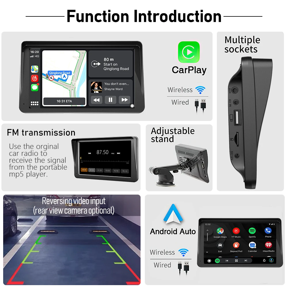 7. Support SD Card, play music and video Wireless Carplay/Wireless Android Auto/Reverse Camera