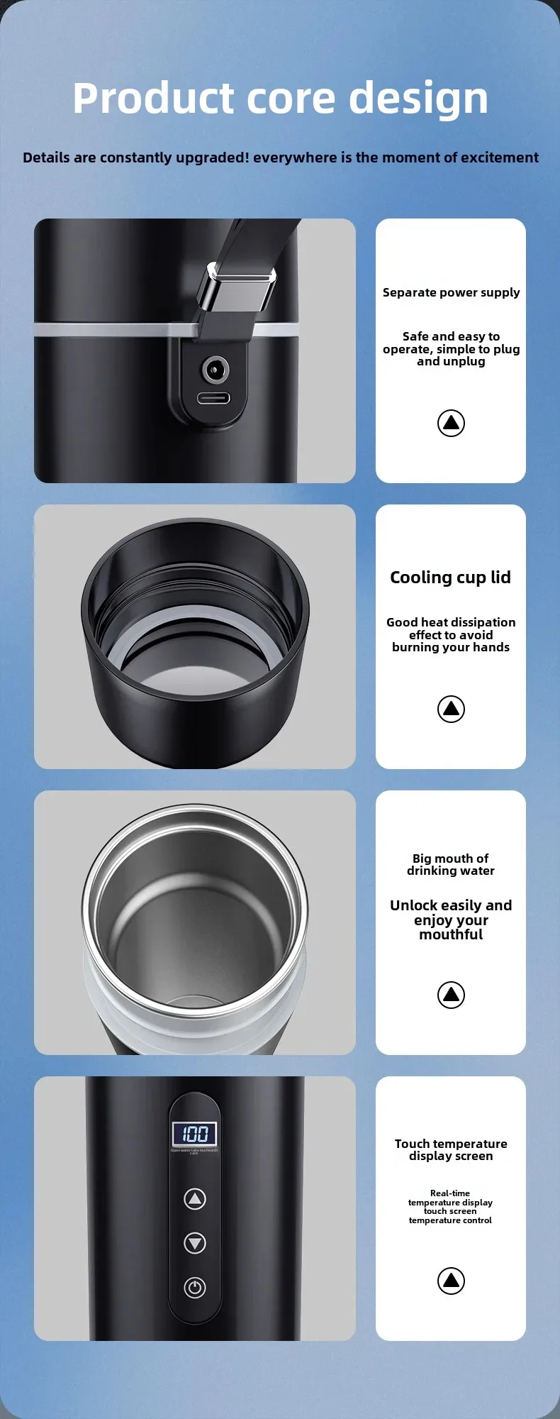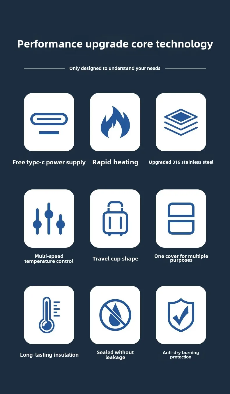 • Integrated design: The integrated design of this water cup combines functionality and style, providing an effective solution for heating beverages while driving.