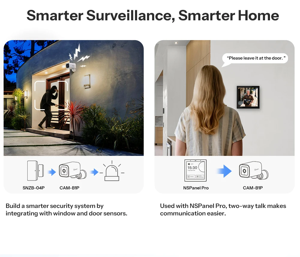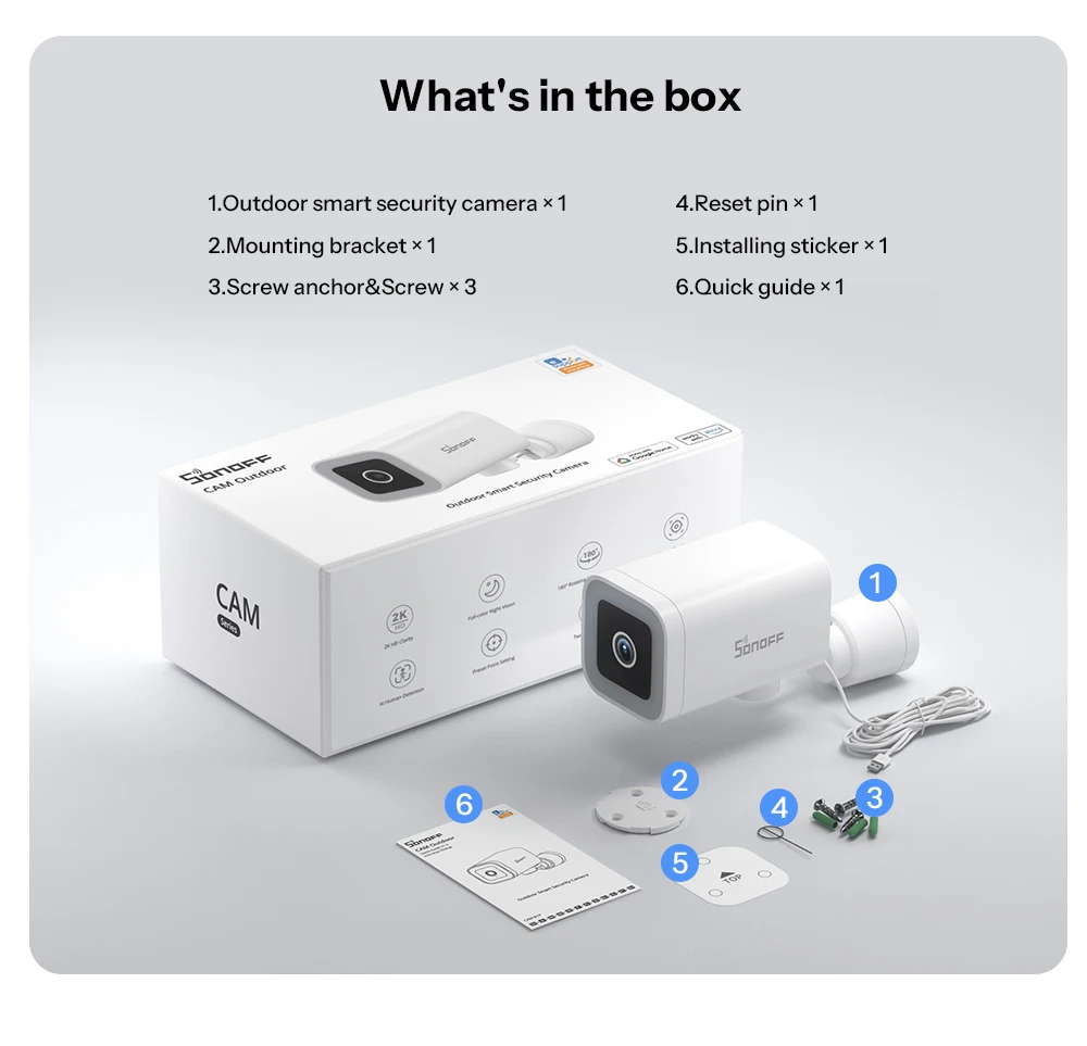 SONOFF CAM-B1P is a smart Wi-Fi outdoor camera that delivers 2K high-definition resolution and full-color night vision, ensuring clear and detailed footage day and night. Its 180° rotating ultra-wide lens expands coverage for comprehensive monitoring. Equipped with AI-powered human detection and intelligent tracking, it accurately identifies and follows suspicious targets in real time. It also supports preset position settings, allowing focused monitoring of key areas. With two-way audio, you can communicate instantly. With the IP65-rated waterproof and dustproof housing, the CAM-B1P performs reliably in various outdoor environments. The SONOFF CAM-B1P provides reliable smart security, giving you peace of mind anytime, anywhere.