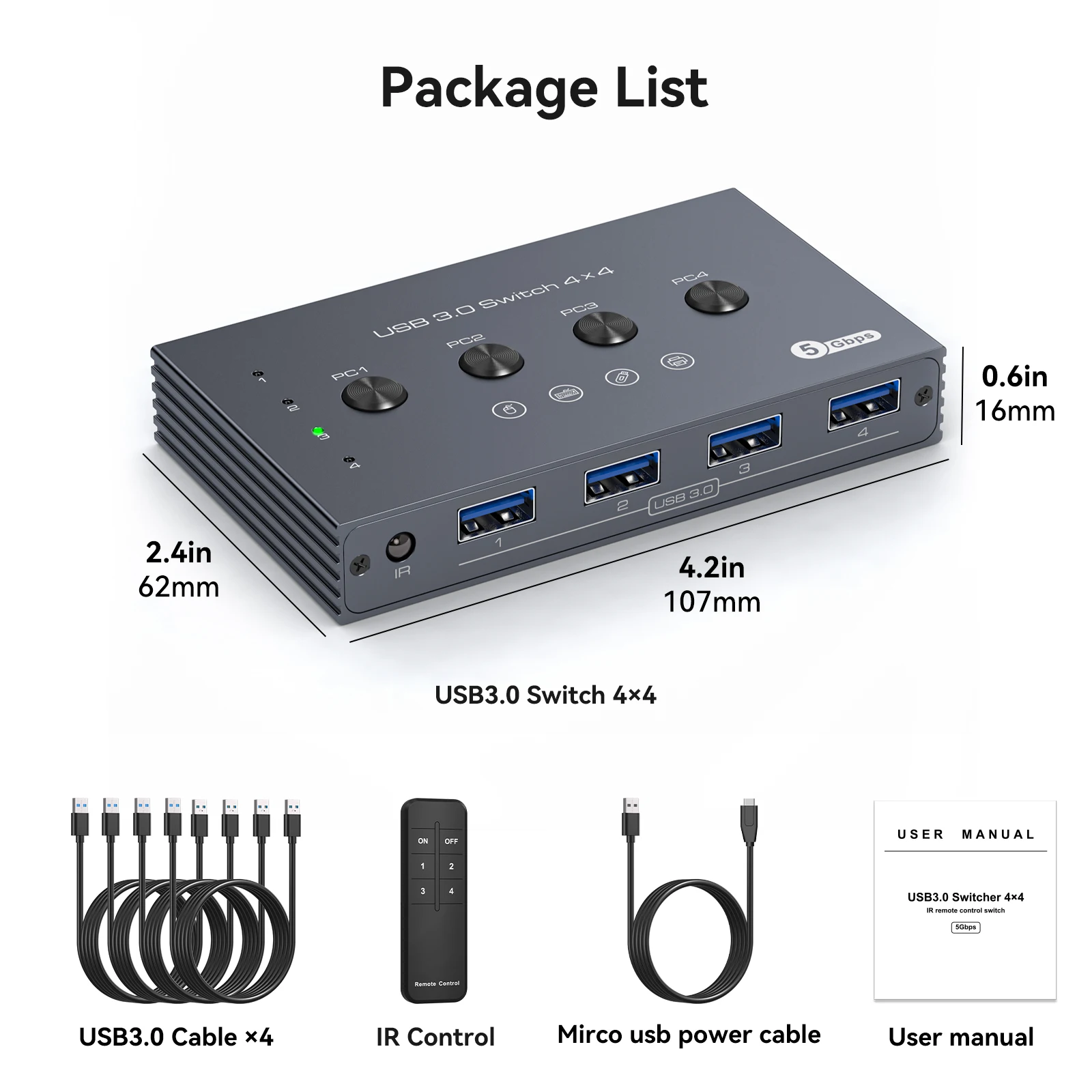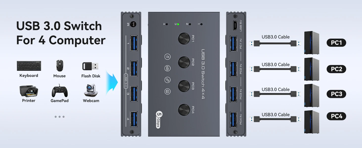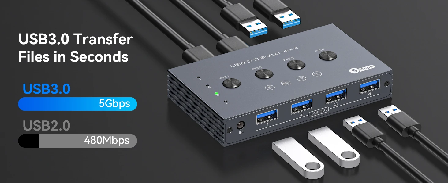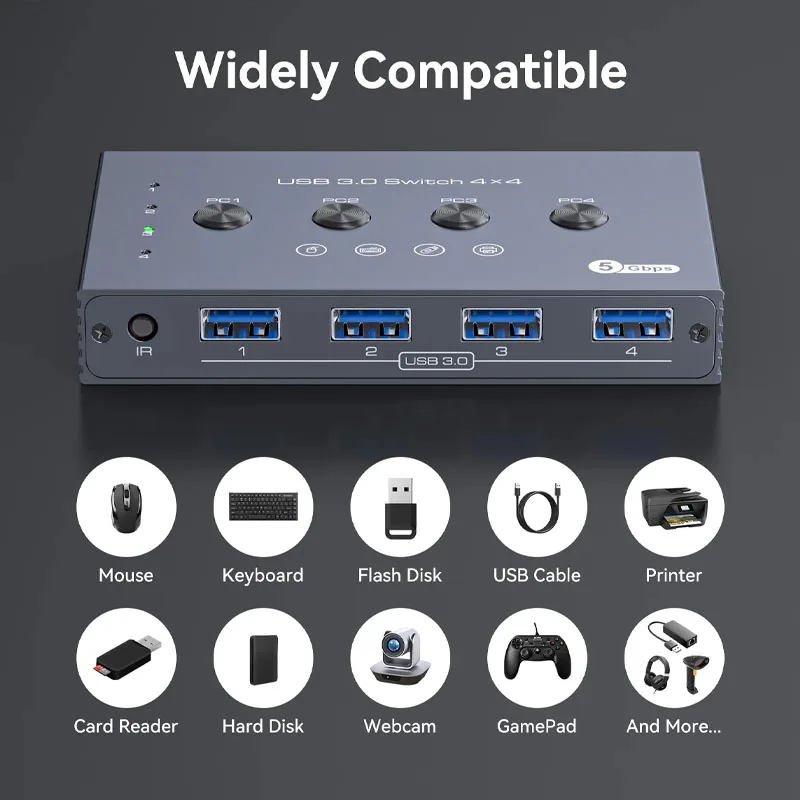 Easily connect peripherals such as keyboard, mouse, printer, USB flash drive, scanner, camera, etc., switching with one click without frequent plugging and unplugging.