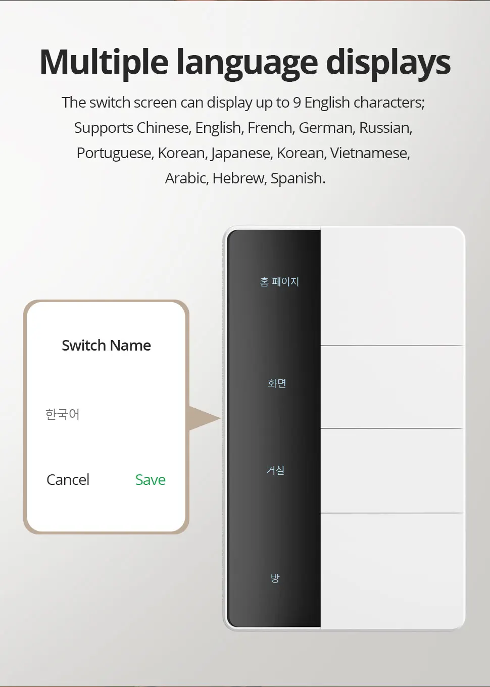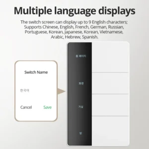 – Multiple language displays: the switch screen can display up to 9 English characters. Supports Chinese, English, French, German, Russian, Portuguese, Korean, Japanese,Vietnamese, Arabic, Hebrew, Spanish.
