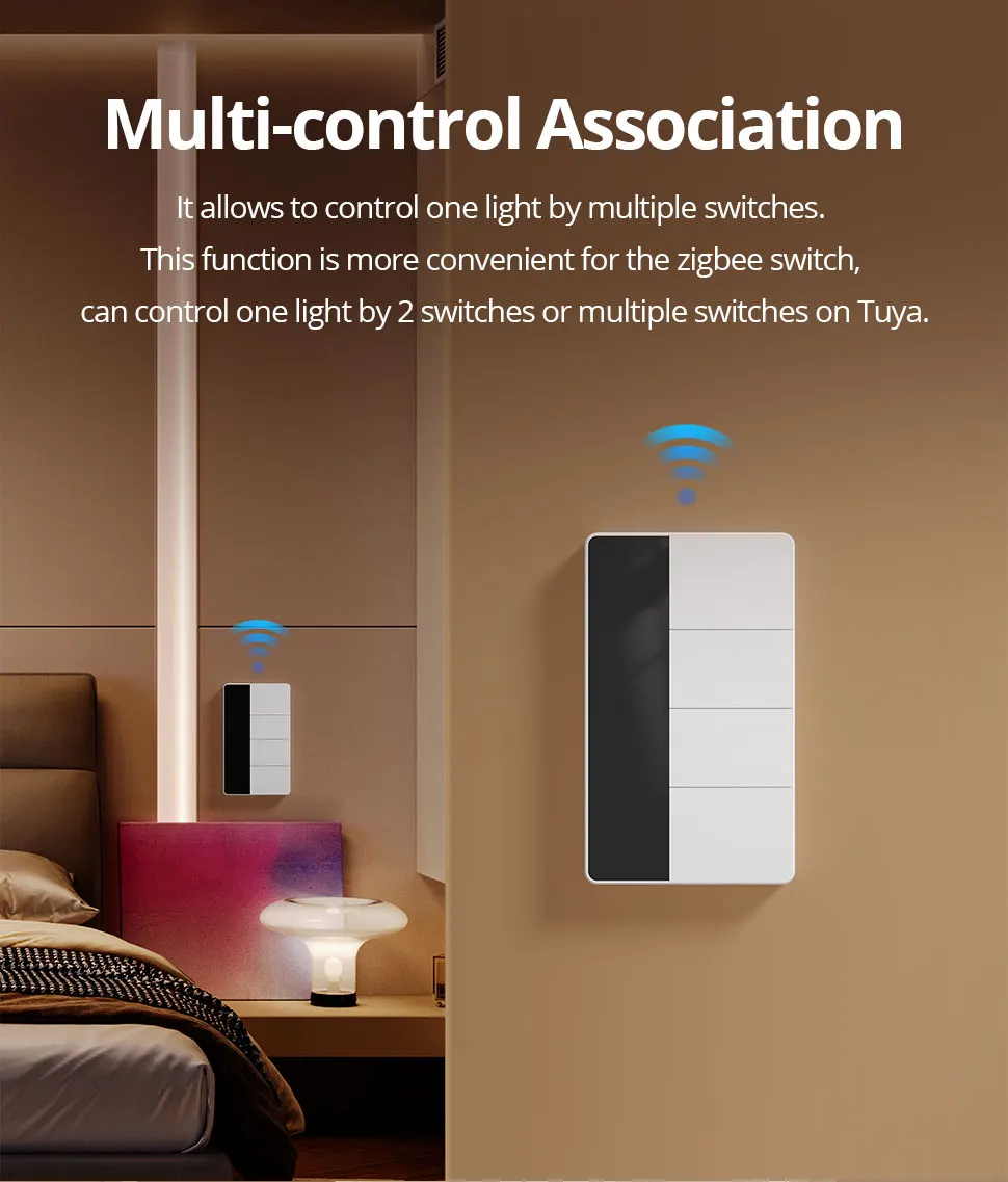 – Multi-control Association: it allows to control one light by multiple switches.This function is more convenient for the zigbee switch,can control one light by 2 switches or multiple switches on Tuya.