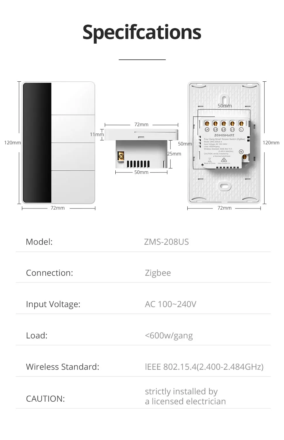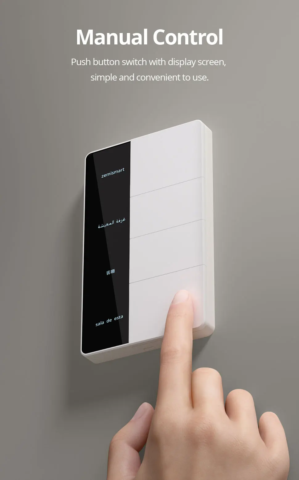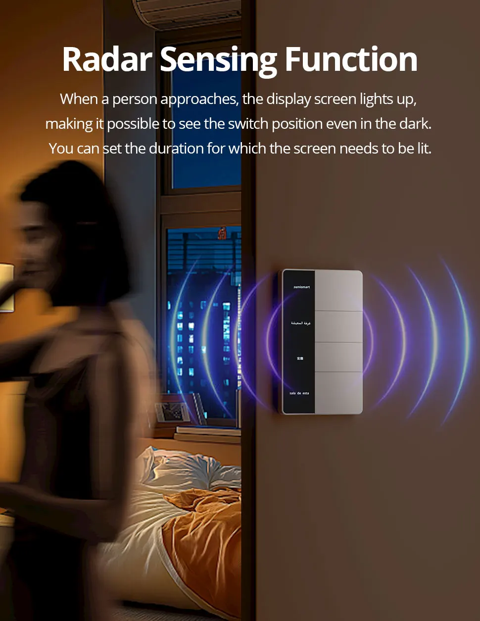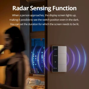 – Sensing Function: When a person approaches, the display screen lights up, making it possible to see the switch position even in the dark.
