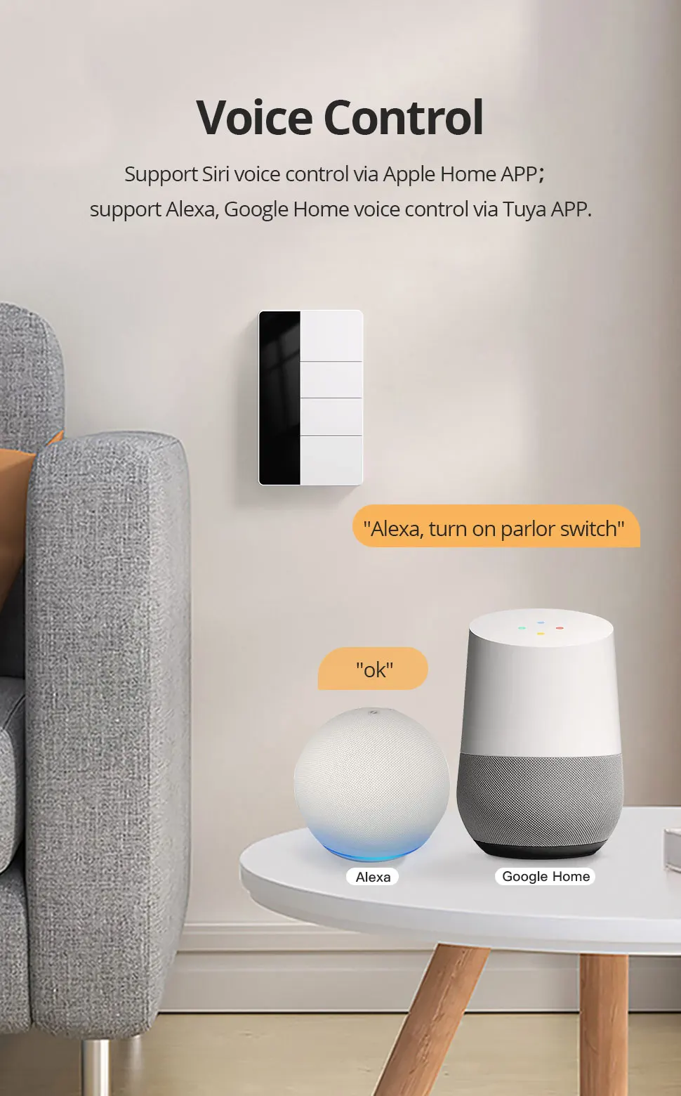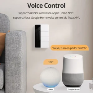 – Voice Control: Can be controlled by a smart speaker, such as Alexa/ Google Home / Bixby voice control via Tuya.